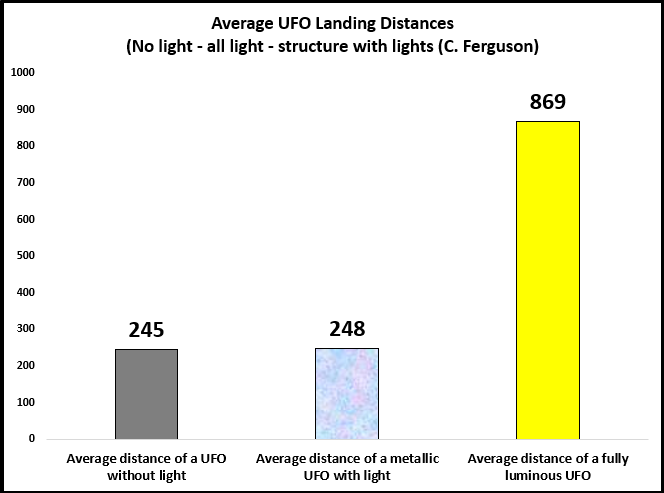In the cases of UFOs without light and structures with light, the average distance to the witness is almost the same (245 and 248 meters, respectively).