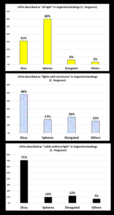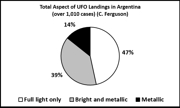 In my work on UFO landings in Argentina, a preliminary study determined that, out of 1,341 cases, 1,192 were described as «luminous objects» (89%) and 149 as «objects without light» (11%).