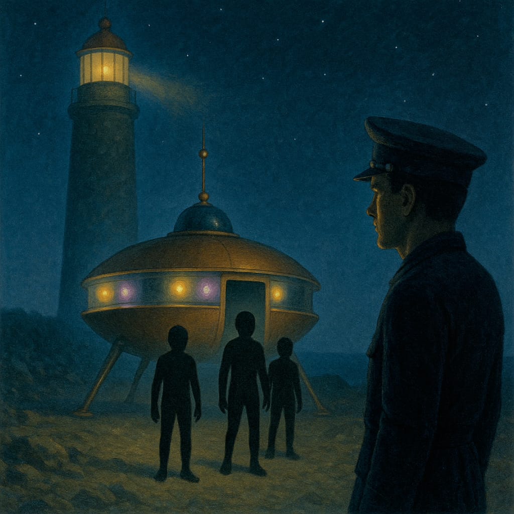 The door closed on the side, and the craft began to ascend, emitting a whirring noise until it reached about 30 meters, judging by the height of the lighthouse (66 meters).