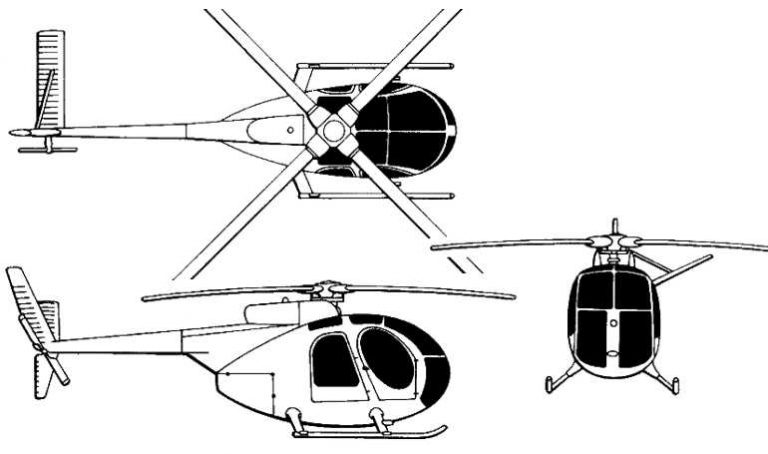 Model 500 C = One 207 kW Allison 250 C-20 gas turbine engine driving a four-blade main rotor and a two-blade tail rotor. Main rotor diameter: 8 m³, fuselage length: 7 m³, height: 2 m³. Maximum cruise speed: 232 km/h (144 mph); long-range cruise speed: 217 km/h (133 mph). Initial climb rate: 518 meters per minute (1,600 ft/min). Operating ceiling: 3,962 meters (12,200 ft). Range: 605 km (370 mi).